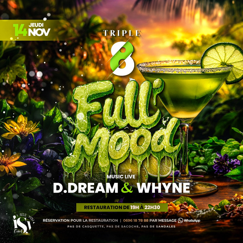 JEUDI 14 Novembre ton rdv du jeudi de 18h30 à 00H !! Full Mood •••••••••••••••••••••••••• #OuvertureDesPortes 18h30 Restauration à table disponible de 19h à 22h30 puis snacking de 22h30 à 23h30 LIEU : TRIPLE8 (ex Bout du Monde) TENUES ET ESPRITS CORRECTS EXIGÉS; LA DIRECTION SE RÉSERVE LE DROIT D'ENTREE. Il est conseillé d'arriver tôt car une invitation ne garantit pas le droit d'accès et privilégier le covoiturage