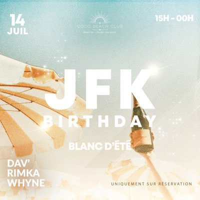 JFK Birthday Blanc d’été Vendredi 14 Juillet JFK fête son anniversaire au COCO BEACH CLUB sur la plage de l'hotel du Bakoua. Horaires 15h à 00h Au programme: Une ambiance signée JFK les Pieds dans l’eau!!! Avec pour annimation musicale: - Dj Dav - Dj Rimka - Dj Whyne Info table booking: 0696 38 41 14 0696 94 38 66 0696 11 39 46