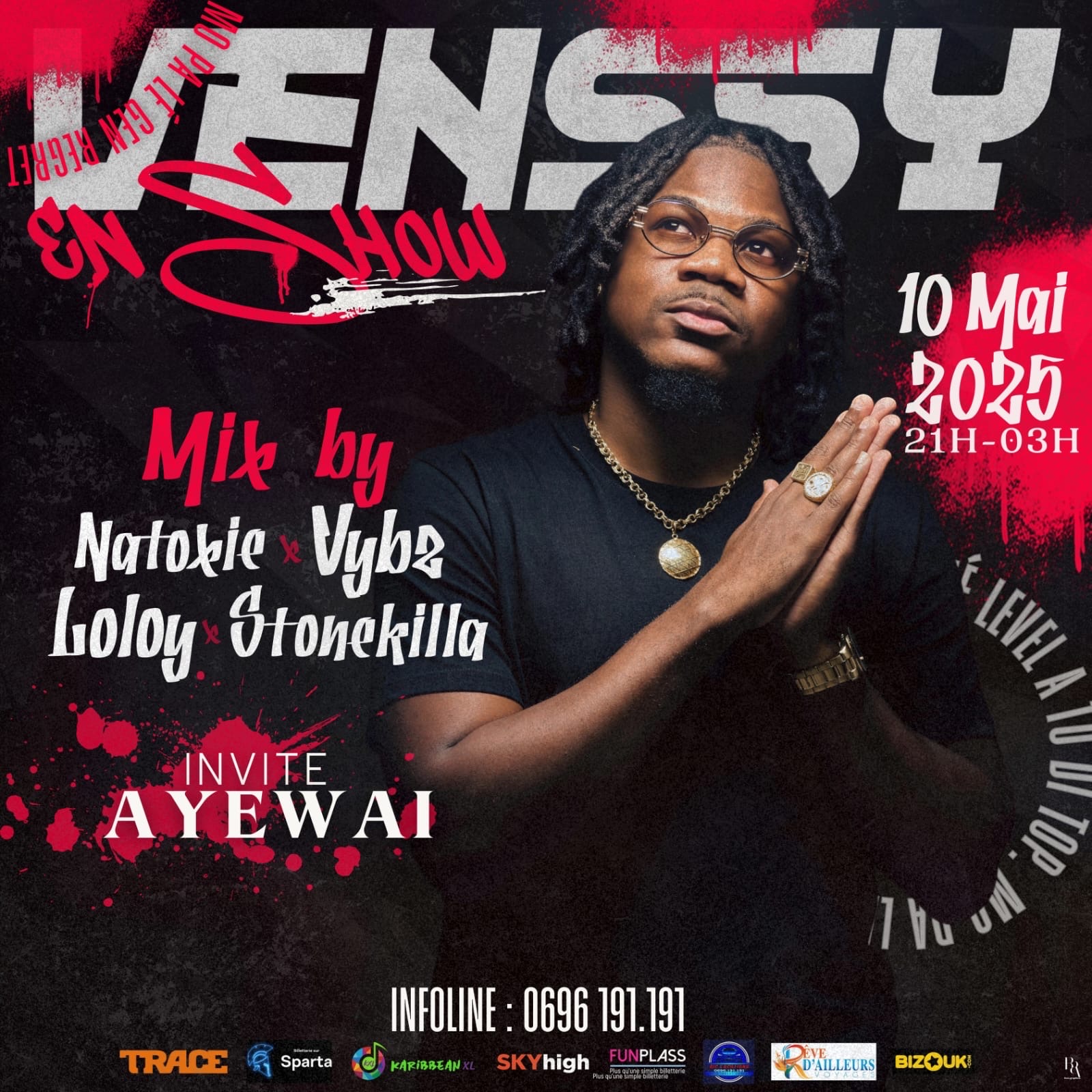 VENSSY, La Révélation Urbaine Guyanaise de l'année, débarque en Show Live pour la première fois en Martinique. VENSSY l'artiste le plus prometteur de sa génération va renverser la Martinique…. Artiste invité, le show-man de mada AYEWAI (di rhunm, no wata) Mixé par : Natoxie - Vybz - Loloy - Stonekilla Shop Vite ta place, car il n'en aura pas pour tout le monde ! ! !