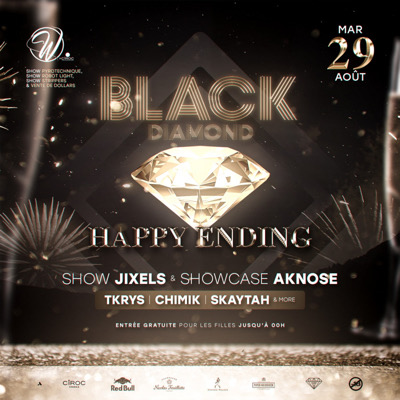Hello la Diamond’Family Bon…. On ne pouvait bien évidemment pas se quitter aussi tôt alors qu’il reste encore 1 semaine pour cette période estivale Quoi de mieux qu’un « happy ending » pour clôturer cet été mouvementé Et pour cela, on te donne rendez vous ce mardi 29 pour la BLACK DIAMOND édition « Happy Ending » Au W by Ciroc, comme d’habitude pour assurer le diamond prestige ! Avec aux platines DJ TKRYS | CHIMIK | SKAYTAH and more… Pour peaufiner ce plateau de fou, les guests AKNOSE et...