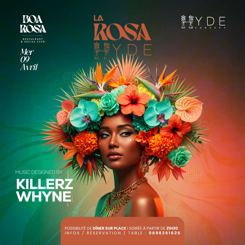 LA BOA HYDE,TOUS LES MERCREDIS Au Boa Rosa Dès 19h au rdc, profitez d’un dîner raffiné pour savourer chaque instant, pense à réserver À partir de 21h30 à l’étage, place à la fête avec Dj KILLERZ & WHYNE aux platines pour un set enflammé Infos/Résas/Salons : Nico - 0696261526