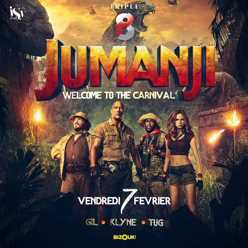 VENDREDI 07 FÉVRIER rdv pour une partie de dés de serez vous prêt à jouer avec nous... de 19h30 à 02h!! JUMANJI Édition: Welcome to The Carnival •••••••••••••••••••••••••• #OuvertureDesPortes 19h30 Restauration disponible jusqu'à 21h30 puis snacking de 21h30 à 00h TRIPLE8 Dress code : aventurier - explorateur - Dora... TENUES ET ESPRITS CORRECTS EXIGÉS; LA DIRECTION SE RÉSERVE LE DROIT D'ENTREE. Il est conseillé d'arriver tôt car une invitation ne garan...
