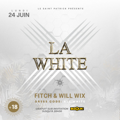 La White La White c'est le plus gros concept de l'île tous les lundis au saint Patrick. DJ FITCH & DJ WILL WIX Dress code : Tout en blanc Invitation valable jusqu’a 20h30