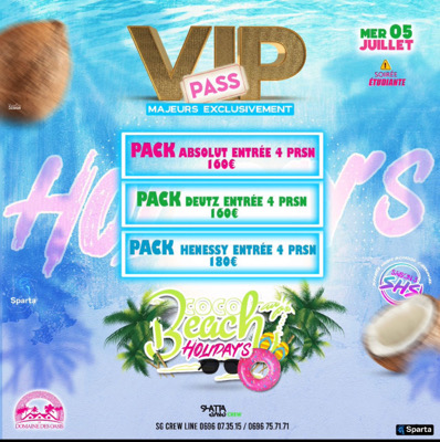 🚨 *LANCEMENT DES PACK VIP* ⚜️🥂 🌊 *C🥥C 🥥 BEACH* 🌴⛱️Holidays 🏄🏾♀️ Mercredi 5 Juillet 20h-3h 🚨 *PACK VIP (limité)* dispos sur l’application Sparta 🌬️ *Espace Puff/Chicha* <<<< Infos Line ou *réservations physiques*: 0696 757171/073515