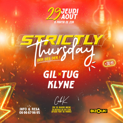 STRICTLY THURSDAY SAISON 2 LA DER DES DER La base INTERDIT aux - moins de 30 ans (certains diront que c’est un plan de vieux mais on est bien plus jeunes qu’eux ) Ahhhhh la vie qu’on mène ! Pour la DER DES DER avec nous, on t’a prévu les meilleurs CAB’K à FORT-DE-FRANCE mix by *GIL x KLYNE & TUG* Rdv dès 20h, le jeudi est à nous Tickets sur Bizouk : Tapas & Drinks Possibilité de réserver des salons INFOLINE : 0696679695